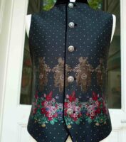 Dirndl mit Ausschnitt und Stehkragen aus orginal schwarzwälder Samt. Bestickt wird der schwarze Baumwollsamt in einer Stickerei am Bodensee. Der kleine Stehkragen sowie die Paspel am Aussnitt wurden aus maigrünem Loden gefertigt. Schürze aus rotem Schürzenstoff mit Applikationen .