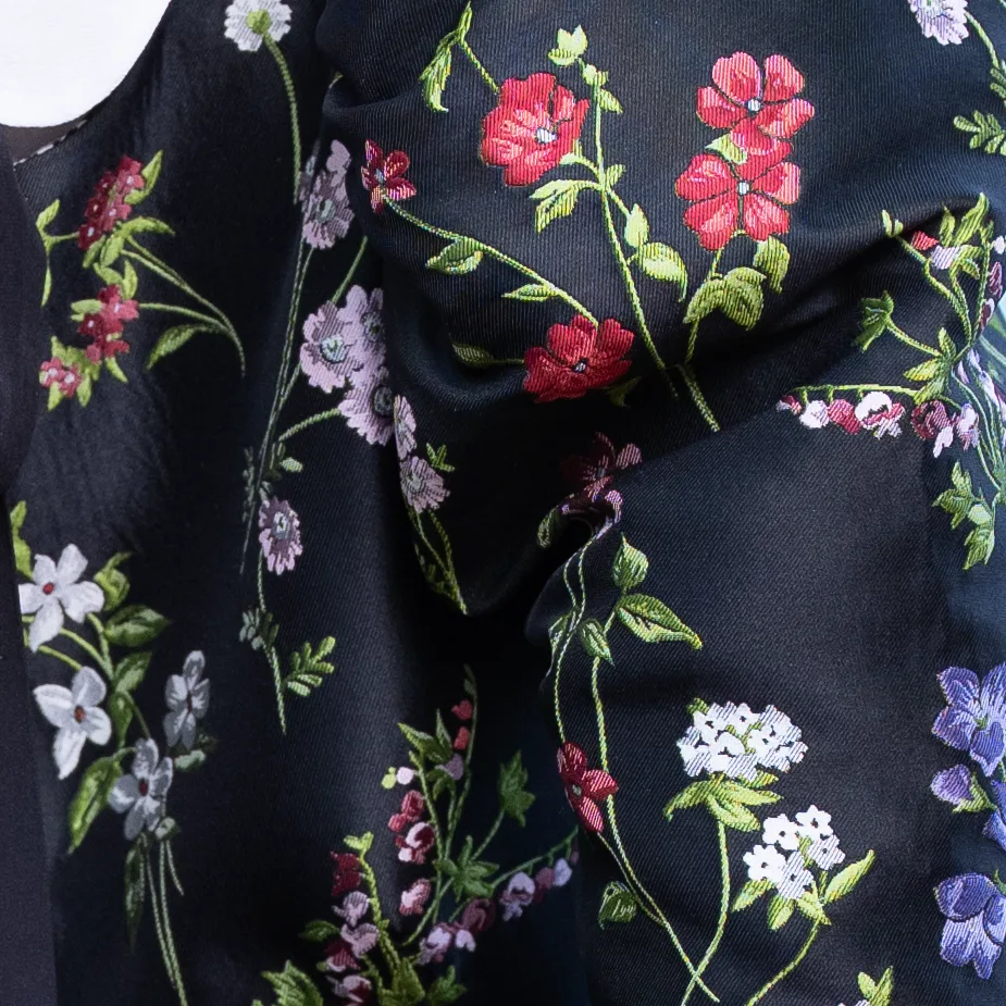 Schwarzes Kleid aus geblümten Jacquard Stoff mit weitem Faltenrock und opulenten Puffärmeln. Dazu eine Schürze aus Seidenorganza, eine Gobelin Tasche mit Fellgriff und Fliegerhaube aus grünem glitzerndem Stoff.